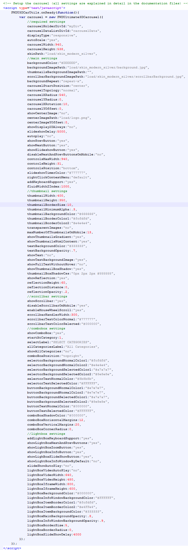 - Next step is to initialize the carousel with javascript, in the head section add code from the below image. Please note that all parameters are described in the constructor parameters section