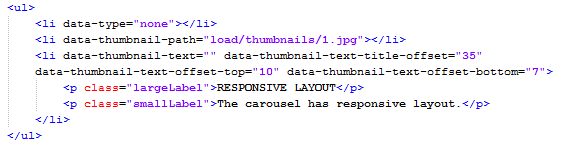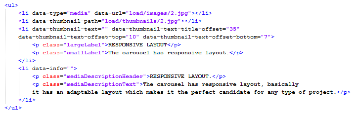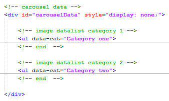 - Next step is to add the in the body element an <div> element which represents the carousel datalist, this <div> element must have an unique id which is passed in the constructor. Inside this <div> element the carousel categories are constructed. This is best illustrated in the below image. To add categories just copy and paste an <ul> element with an attribute data-cat (please note that in the below image the html code is minimized, to view the entire html code observe the start_images_responsive_or_fixed.html). Make sure you read the carousel datalist section to understand how to add more cateogries, thumbnails and configure the carousel datalist.