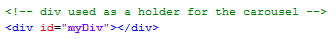 - You need a <div> element into which the carousel will be added as a child. This <div> element (the carousel's parent) can be located anywhere inside the page based on the page layout, so create a <div> and set an id for it, the id is important because it is passed in the carousel constructor, make sure it is unique. The div width and height and background color are set in the constructor, (example in the image below)