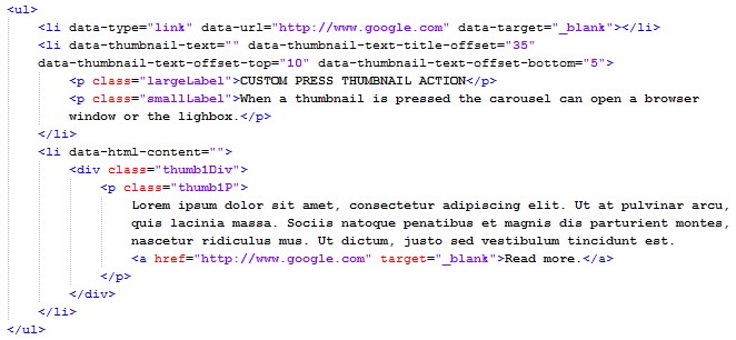 In the case that you set the data-type to "none", then it will enable the thumbnails html content to be active such that you can click on the links or buttons etc. Also in this case you can also remove the <li> element for the text leaving just the html content visible, just like in the image below: