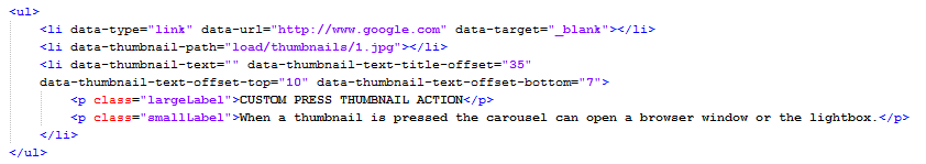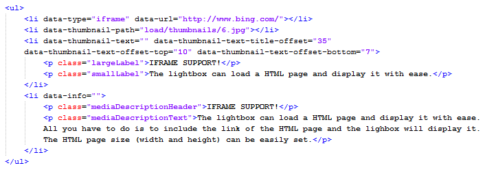 To add a html page (iframe) add the code from the below image into the datalist <ul> just like the image below. The first <li> element represents the url of the html page which you want to display in the iframe, the second <li> element represents the thumbnails path, the third <li> element represents the thumbnail description and the forth <li> element represents the lightbox description.The three extra text settings are used separately for each thumb to set the thumbnail text description and title. The first one text-title-offset is used to show more or less of the text in case of a title on double lines for example, or it can even be 0 if you don't want the title to be displayed at all except on mouse hover. The next two settings text-offset-top and text-offset-bottom are used to position the text after it is fully displayed at mouse hover such that it can be centralised better.