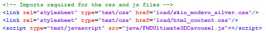Please note that in the html file which is used as reference we have used the "skin_modern_silver" skin, if you need another skin replace it by modifying the skin graphics path setting from the carousel constructor "skinPath". All skins are located in the load folder along with the images and css files.