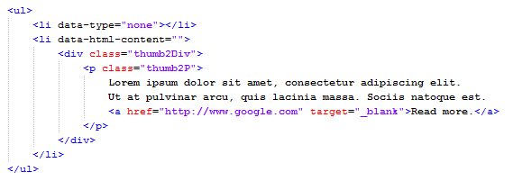 To add a html content add the code from the below image into the datalist <ul> just like the image below. The first <li> element represents the link data as you can see you can add the url to open when the thumbnail is pressed and the url target, the second <li> element represents the div that contains any html content you want also with CSS, the third <li> element represents the thumbnail description and the forth <li> element represents the lightbox description.The three extra text settings are used separately for each thumb to set the thumbnail text description and title. The first one text-title-offset is used to show more or less of the text in case of a title on double lines for example, or it can even be 0 if you don't want the title to be displayed at all except on mouse hover. The next two settings text-offset-top and text-offset-bottom are used to position the text after it is fully displayed at mouse hover such that it can be centralised better.