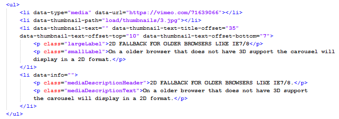 To add a video from vimeo add the code from the below image into the datalist <ul> just like the image below. The first <li> element represents the url of the video which you want to display, the second <li> element represents the thumbnails path, the third <li> element represents the thumbnail description and the forth <li> element represents the lightbox description. The three extra text settings are used separately for each thumb to set the thumbnail text description and title. The first one text-title-offset is used to show more or less of the text in case of a title on double lines for example, or it can even be 0 if you don't want the title to be displayed at all except on mouse hover. The next two settings text-offset-top and text-offset-bottom are used to position the text after it is fully displayed at mouse hover such that it can be centralised better.