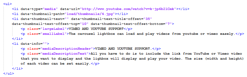 To add a video from youtube add the code from the below image into the datalist <ul> just like the image below. The first <li> element represents the url of the video from youtube which you want to display, the second <li> element represents the thumbnails path, the third <li> element represents the thumbnail description and the forth <li> element represents the lightbox description.The three extra text settings are used separately for each thumb to set the thumbnail text description and title. The first one text-title-offset is used to show more or less of the text in case of a title on double lines for example, or it can even be 0 if you don't want the title to be displayed at all except on mouse hover. The next two settings text-offset-top and text-offset-bottom are used to position the text after it is fully displayed at mouse hover such that it can be centralised better.