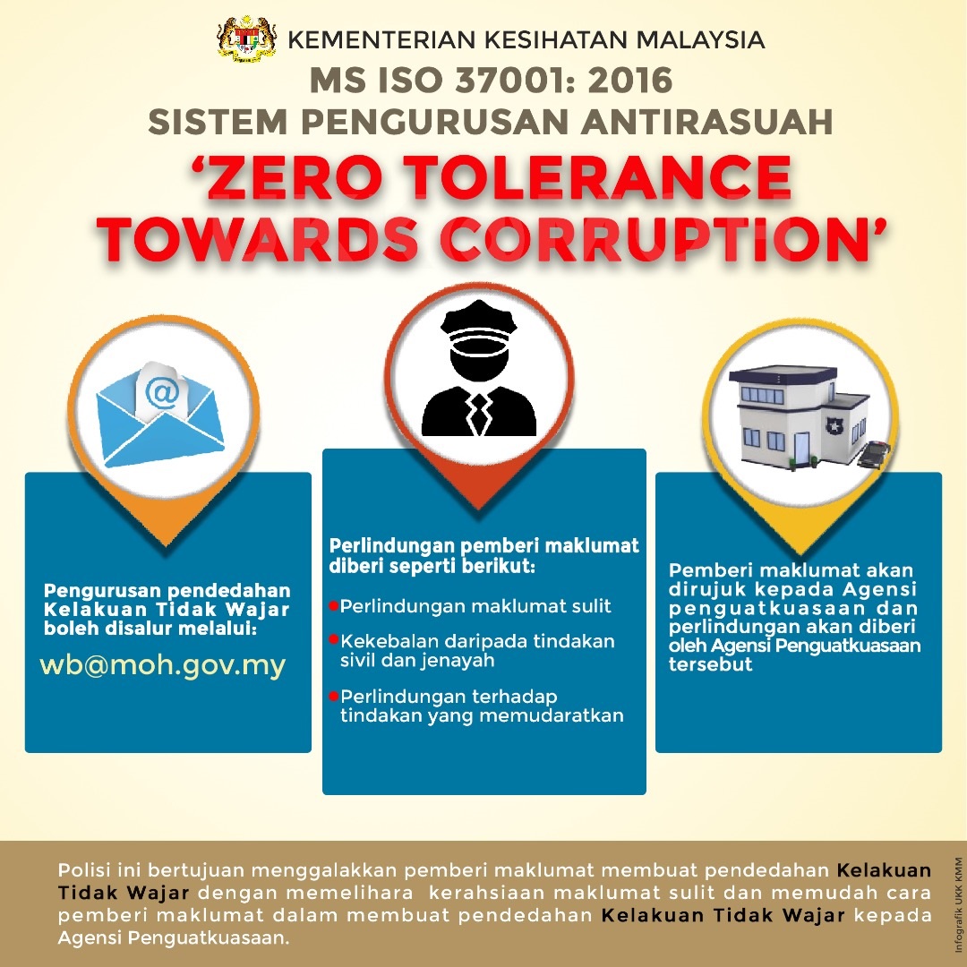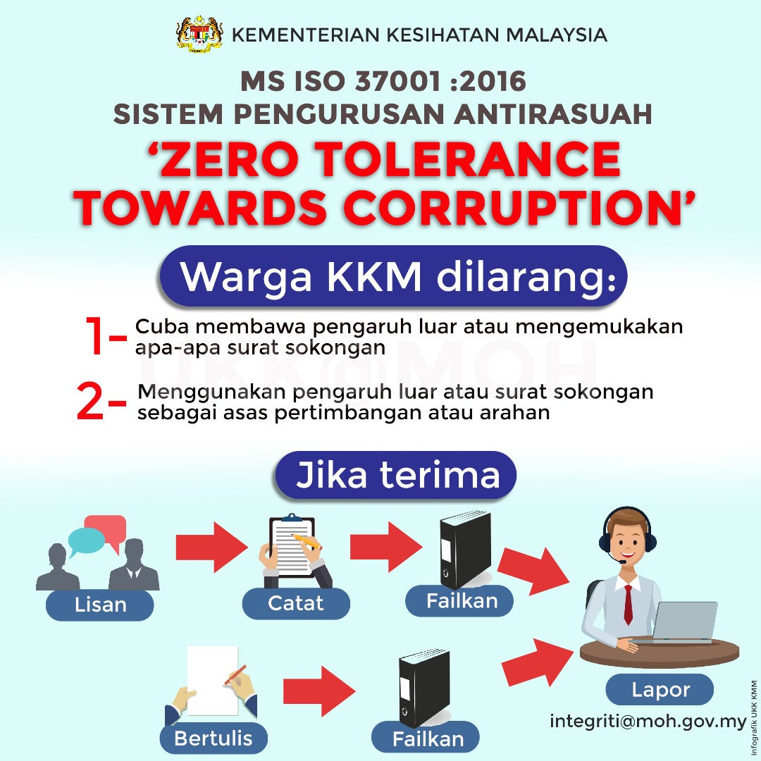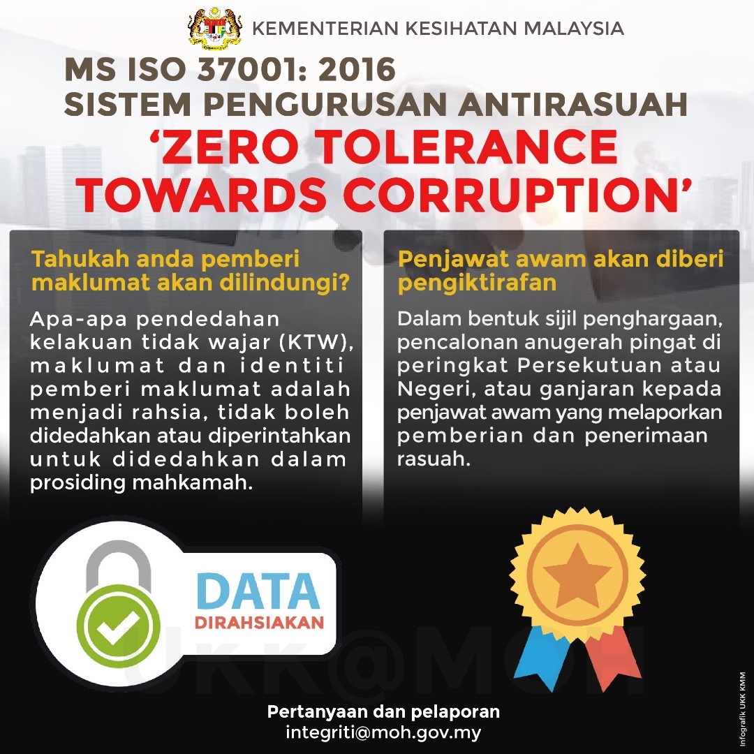 Sistem Pengurusan AntiRasuah atau Anti-Bribery Management System (ABMS) telah mula dilaksanakan di Kementerian Kesihatan Malaysia sejak tahun 2019 bagi mencapai matlamat “Toleransi Sifar Terhadap Rasuah” serta bagi membudayakan nilai-nilai integriti yang tinggi di kalangan warga kerja KKM. Berdasarkan pematuhan terhadap piawaian standard MS ISO 37001:2016 ABMS yang terkini, pensijilan MS ISO 37001:2016 ABMS Kementerian telah disambung bagi tempoh 15 Jun 2025 hingga 25 Jun 2028 dengan empat (4) skop yang berikut: