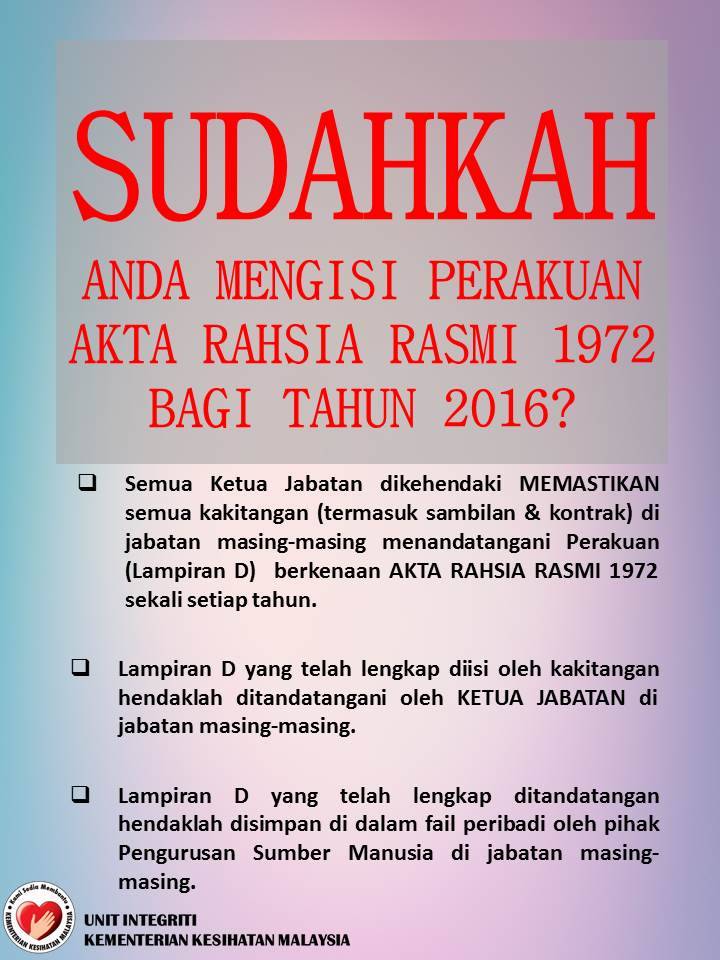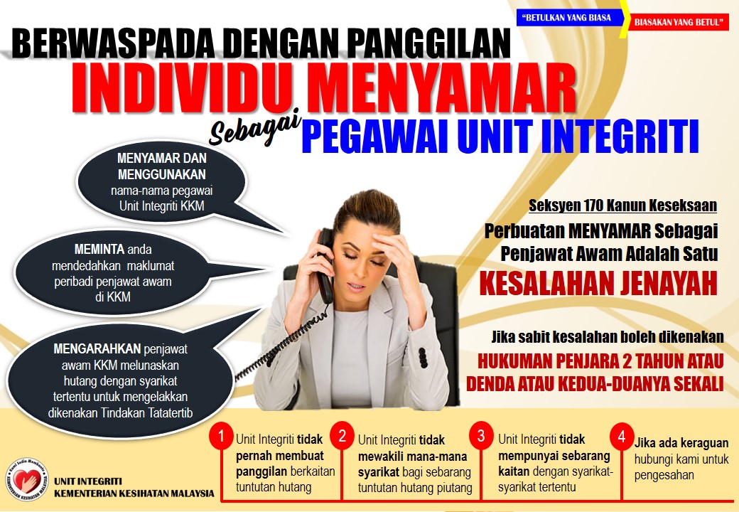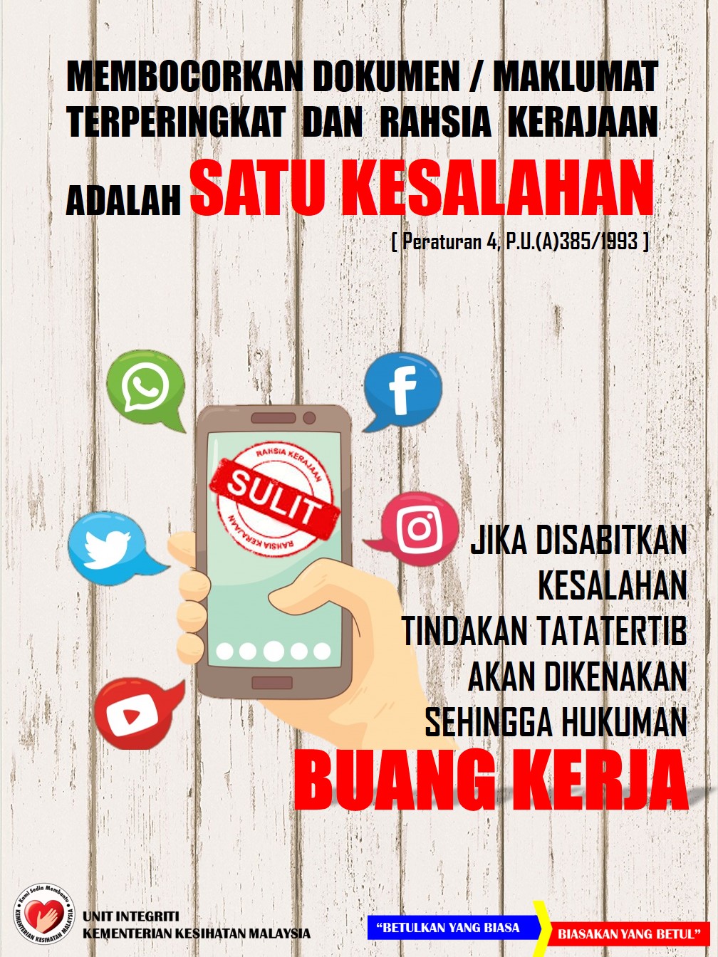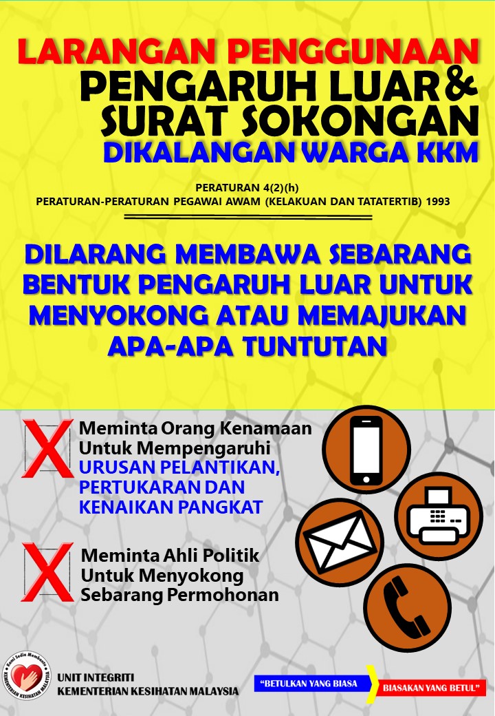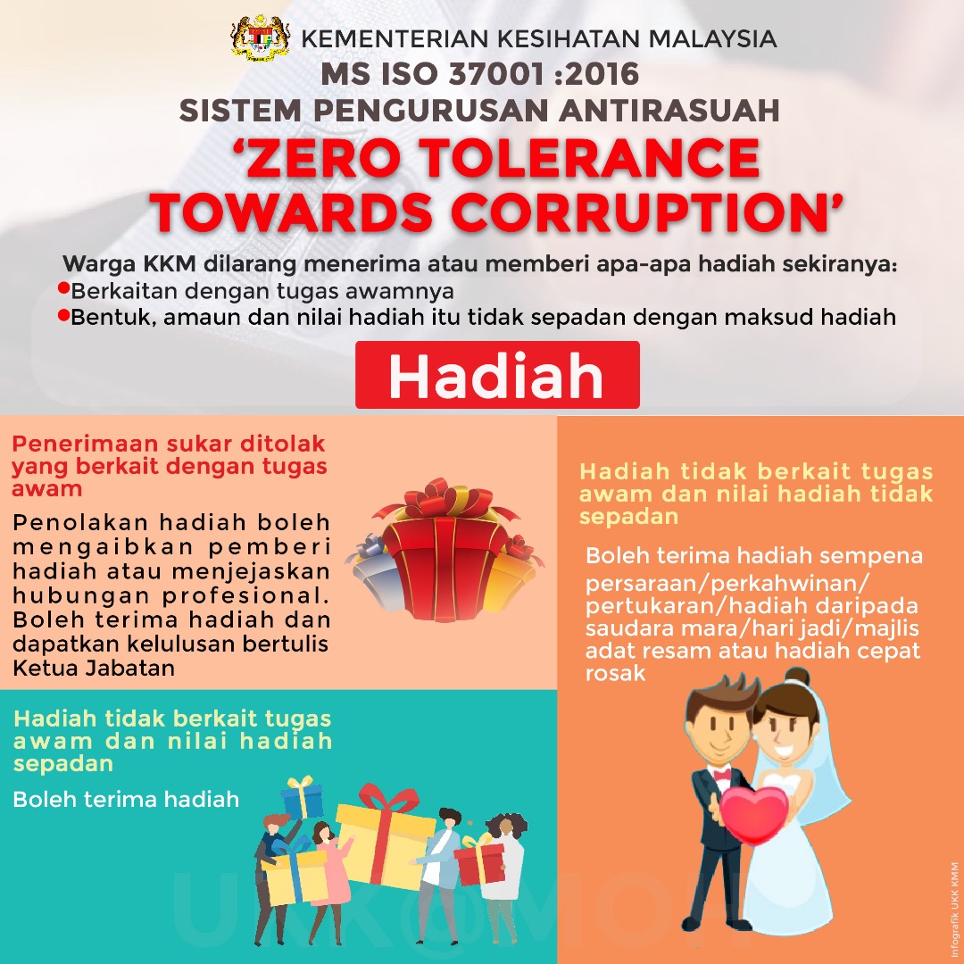 Sistem Pengurusan AntiRasuah atau Anti-Bribery Management System (ABMS) telah mula dilaksanakan di Kementerian Kesihatan Malaysia sejak tahun 2019 bagi mencapai matlamat “Toleransi Sifar Terhadap Rasuah” serta bagi membudayakan nilai-nilai integriti yang tinggi di kalangan warga kerja KKM. Berdasarkan pematuhan terhadap piawaian standard MS ISO 37001:2016 ABMS yang terkini, pensijilan MS ISO 37001:2016 ABMS Kementerian telah disambung bagi tempoh 15 Jun 2025 hingga 25 Jun 2028 dengan empat (4) skop yang berikut: