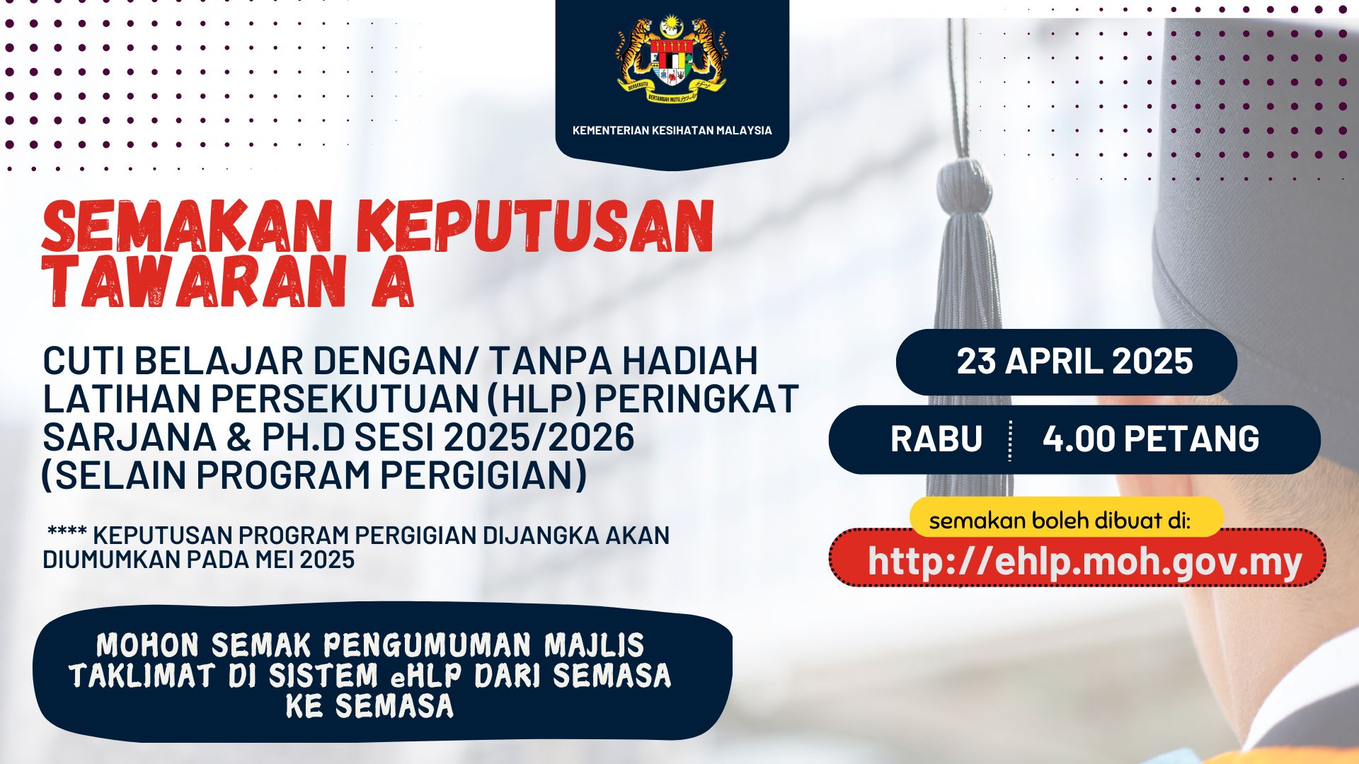 | HEBAHAN SEMAKAN KEPUTUSAN TAWARAN A - CUTI BELAJAR DENGAN/ TANPA HADIAH LATIHAN PERSEKUTUAN (HLP) PERINGKAT SARJANA DAN PH.D (SELAIN SARJANA PERGIGIAN) SESI 2024/2025 03-04-2024 |