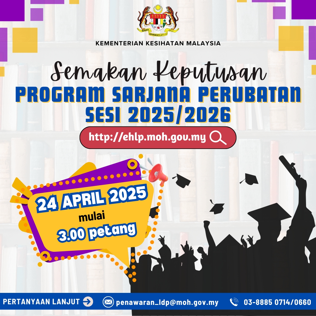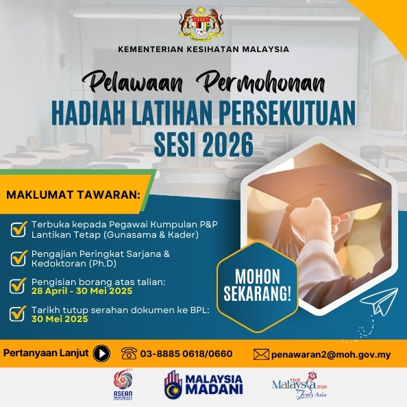 | HEBAHAN TAWARAN MENGIKUTI KURSUS DALAM PERKHIDMATAN SECARA SEPENUH MASA BAGI SESI 2026/2027 DI BAWAH PENAJAAN KEMENTERIAN KESIHATAN MALAYSIA 01-10-2025 |
