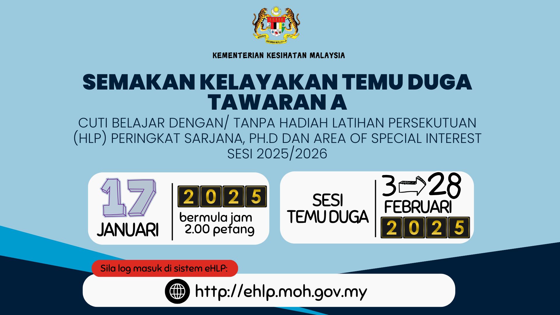 | HEBAHAN SEMAKAN KELAYAKAN TEMU DUGA TAWARAN A CUTI BELAJAR DENGAN/ TANPA HADIAH LATIHAN PERSEKUTUAN (HLP) KEPADA PEGAWAI KUMPULAN PENGURUSAN DAN PROFESIONAL (P&P) (BUKAN GUNASAMA) KEMENTERIAN KESIHATAN MALAYSIA SESI 2024/2025 12-01-2024 |