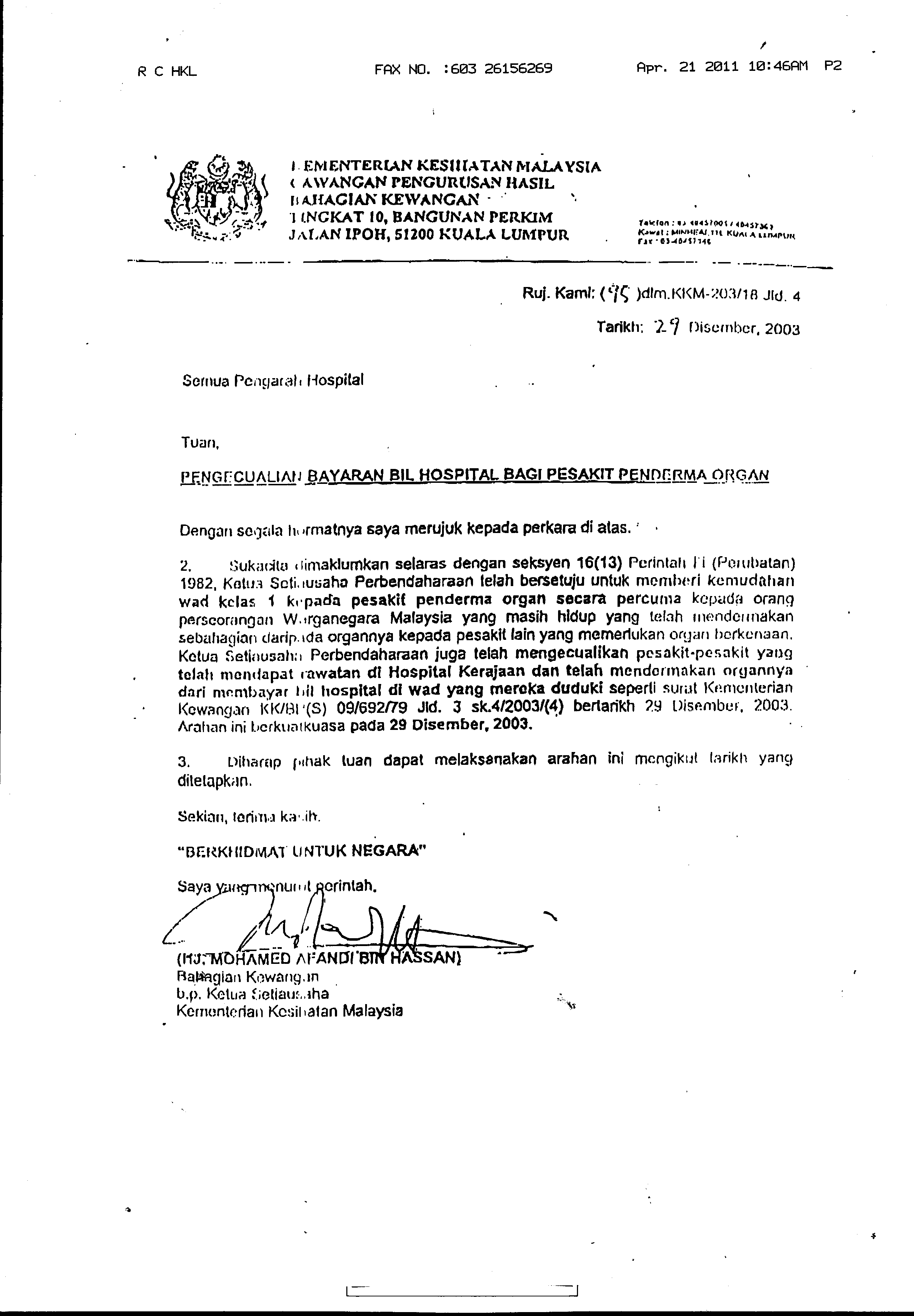 Pekeliling Ketua Pengarah Kesihatan Malaysia Bil.5/2013 : Tatacara Pelaksanaan Dasar Kemudahan Wad Kelas Pertama Dan Pengecualian Bil Perubatan Penderma Organ