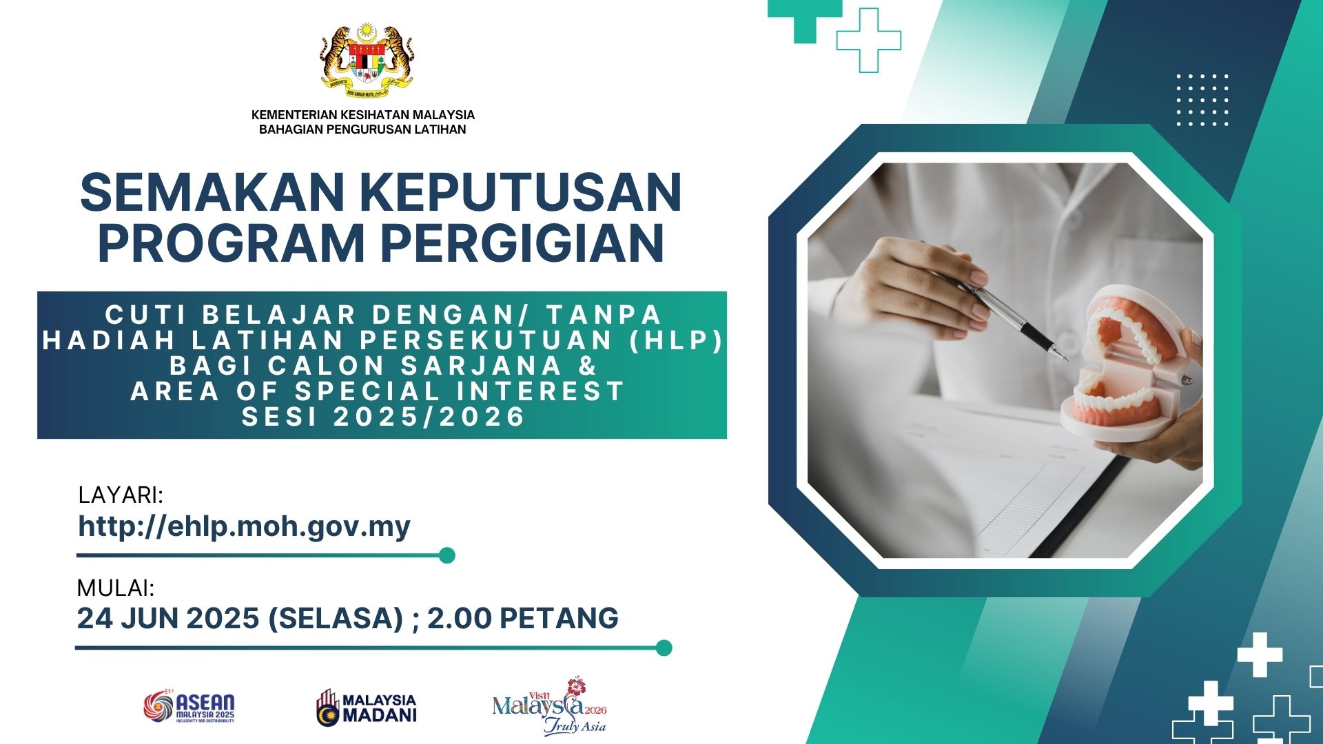 | HEBAHAN SEMAKAN KEPUTUSAN TEMUDUGA CUTI BELAJAR DENGAN/ TANPA HADIAH LATIHAN PERSEKUTUAN (HLP) BAGI PROGRAM PERGIGIAN PERINGKAT SARJANA DAN AREA OF SPECIAL INTEREST KKM SESI 2025/2026 25-06-2025 |