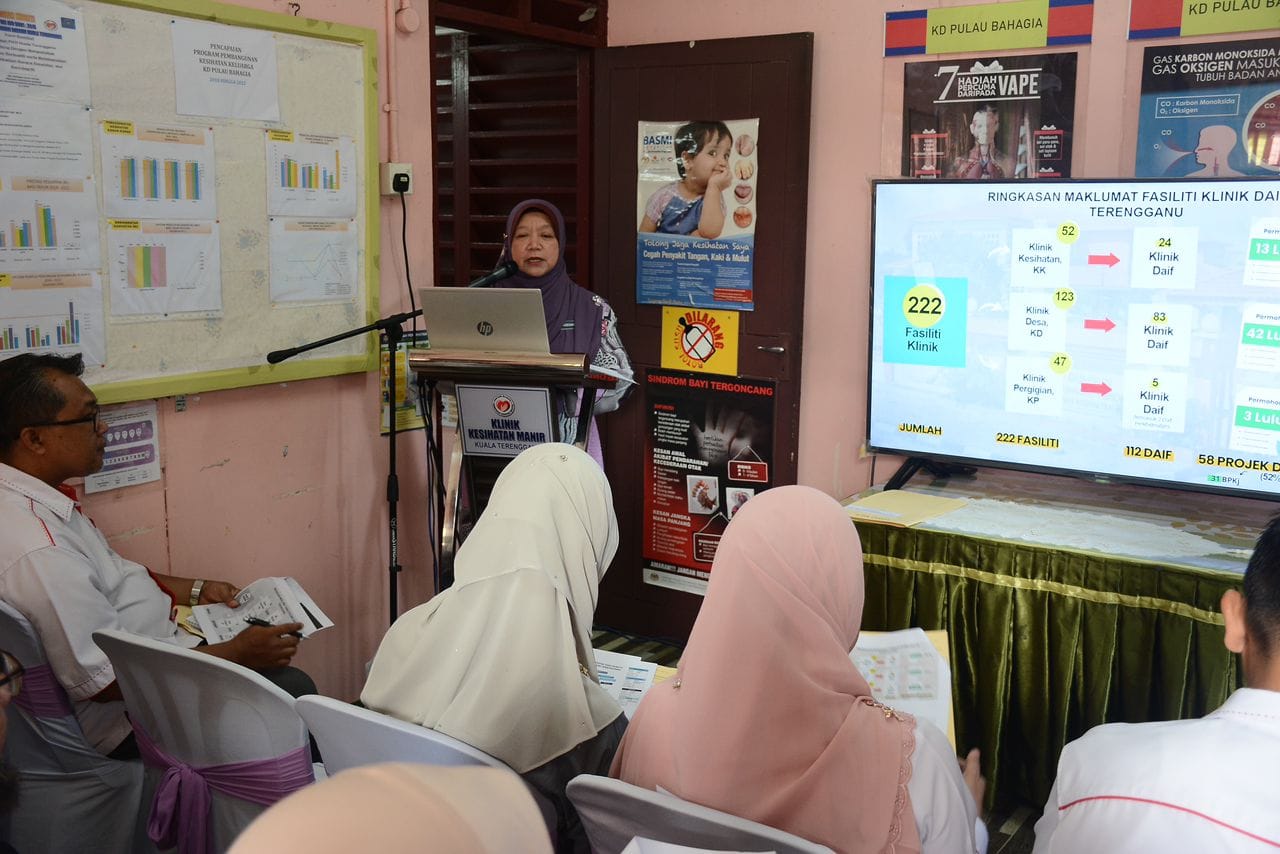 Lawatan YB Dr Zaliha Mustafa bermula di Klinik Desa Pulau Bahagia. Satu sesi taklimat mengenai Projek Pembaikan Klinik dan Fasiliti daif negeri Terengganu telah diberikan oleh YBhg. Dato’ Dr. Hjh Kasemani binti Embong, Pengarah Jabatan Kesihatan Negeri Terengganu, selepas, sesi taklimat YB Dr. Zaliha telah melawat sekitar Klinik Desa Pulau Bahagia.