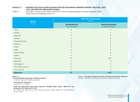 JADUAL 3.1 : BILANGAN KES DAN KADAR KEJADIAN PENYAKIT BERJANGKIT MENGIKUT NEGERI, MALAYSIA, 2018: