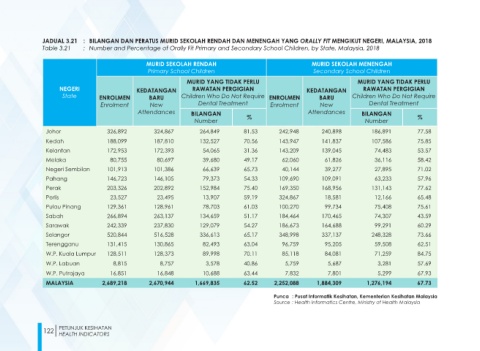 Table 3.21 : Number and Percentage of Orally Fit Primary and Secondary School Children, by State, Malaysia, 2018