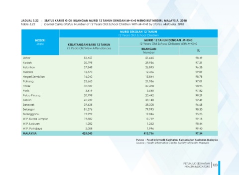 JADUAL 3.22 : STATUS KARIES GIGI: BILANGAN MURID 12 TAHUN DENGAN M+X=0 MENGIKUT NEGERI, MALAYSIA, 2018