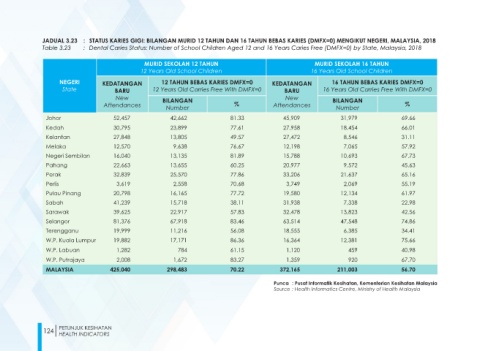 JADUAL 3.23 : STATUS KARIES GIGI: BILANGAN MURID 12 TAHUN DAN 16 TAHUN BEBAS KARIES (DMFX=0) MENGIKUT NEGERI, MALAYSIA, 2018