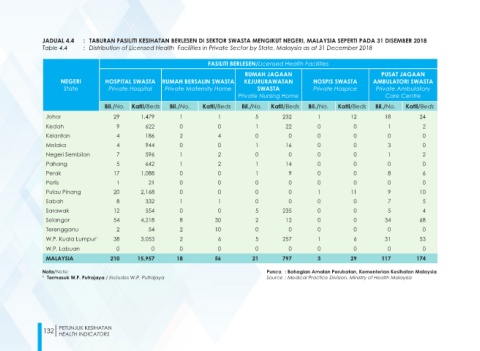 JADUAL 4.4 : TABURAN FASILITI KESIHATAN BERLESEN DI SEKTOR SWASTA MENGIKUT NEGERI, MALAYSIA SEPERTI PADA 31 DISEMBER 2018