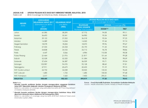 JADUAL 4.42 : LIPUTAN PELALIAN BCG BAGI BAYI MENGIKUT NEGERI, MALAYSIA, 2018