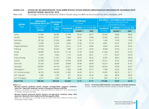 Table 4.53 : Coverage of Antenatal Mothers for Tetanus Toxoid using Live Births as Denominator by State, Malaysia, 2018