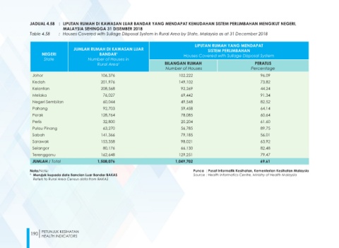 JADUAL 4.58 : LIPUTAN RUMAH DI KAWASAN LUAR BANDAR YANG MENDAPAT KEMUDAHAN SISTEM PERLIMBAHAN MENGIKUT NEGERI,