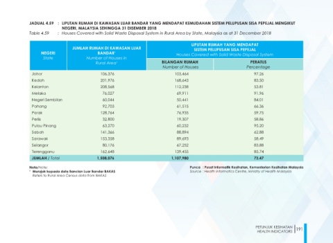 Table 4.59 : Houses Covered with Solid Waste Disposal System in Rural Area by State, Malaysia as at 31 December 2018