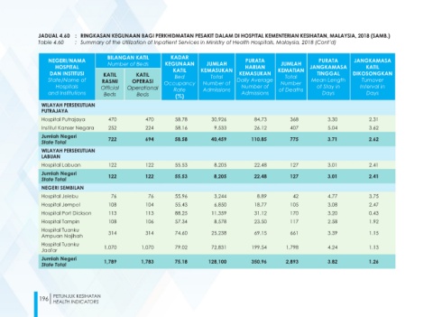JADUAL 4.60 : RINGKASAN KEGUNAAN BAGI PERKHIDMATAN PESAKIT DALAM DI HOSPITAL KEMENTERIAN KESIHATAN, MALAYSIA, 2018 (SAMB.)