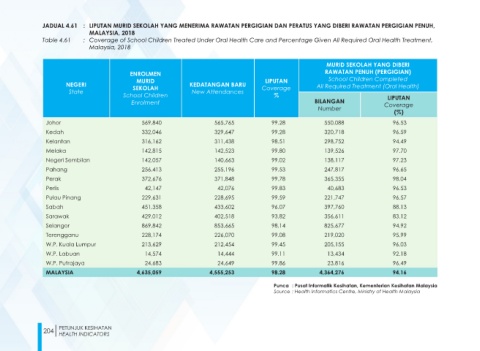 JADUAL 4.61 : LIPUTAN MURID SEKOLAH YANG MENERIMA RAWATAN PERGIGIAN DAN PERATUS YANG DIBERI RAWATAN PERGIGIAN PENUH,