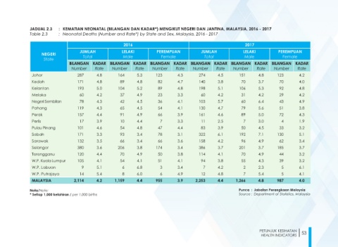 JADUAL 2.3 : KEMATIAN NEONATAL (BILANGAN DAN KADAR*) MENGIKUT NEGERI DAN JANTINA, MALAYSIA, 2016 - 2017