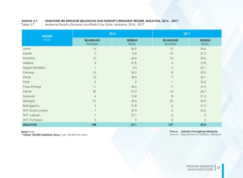 JADUAL 2.7 : KEMATIAN IBU BERSALIN (BILANGAN DAN NISBAH*) MENGIKUT NEGERI, MALAYSIA, 2016 - 2017