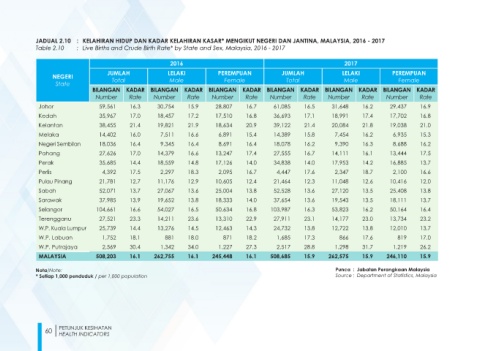 JADUAL 2.10 : KELAHIRAN HIDUP DAN KADAR KELAHIRAN KASAR* MENGIKUT NEGERI DAN JANTINA, MALAYSIA, 2016 - 2017