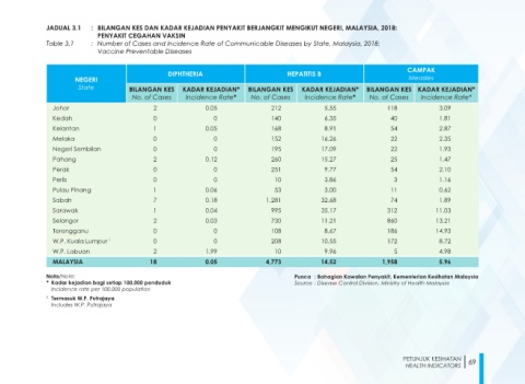 JADUAL 3.1   :   BILANGAN KES DAN KADAR KEJADIAN PENYAKIT BERJANGKIT MENGIKUT NEGERI, MALAYSIA, 2018: