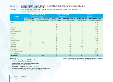 JADUAL 3.1   :  BILANGAN KES DAN KADAR KEJADIAN PENYAKIT BERJANGKIT MENGIKUT NEGERI, MALAYSIA, 2018: