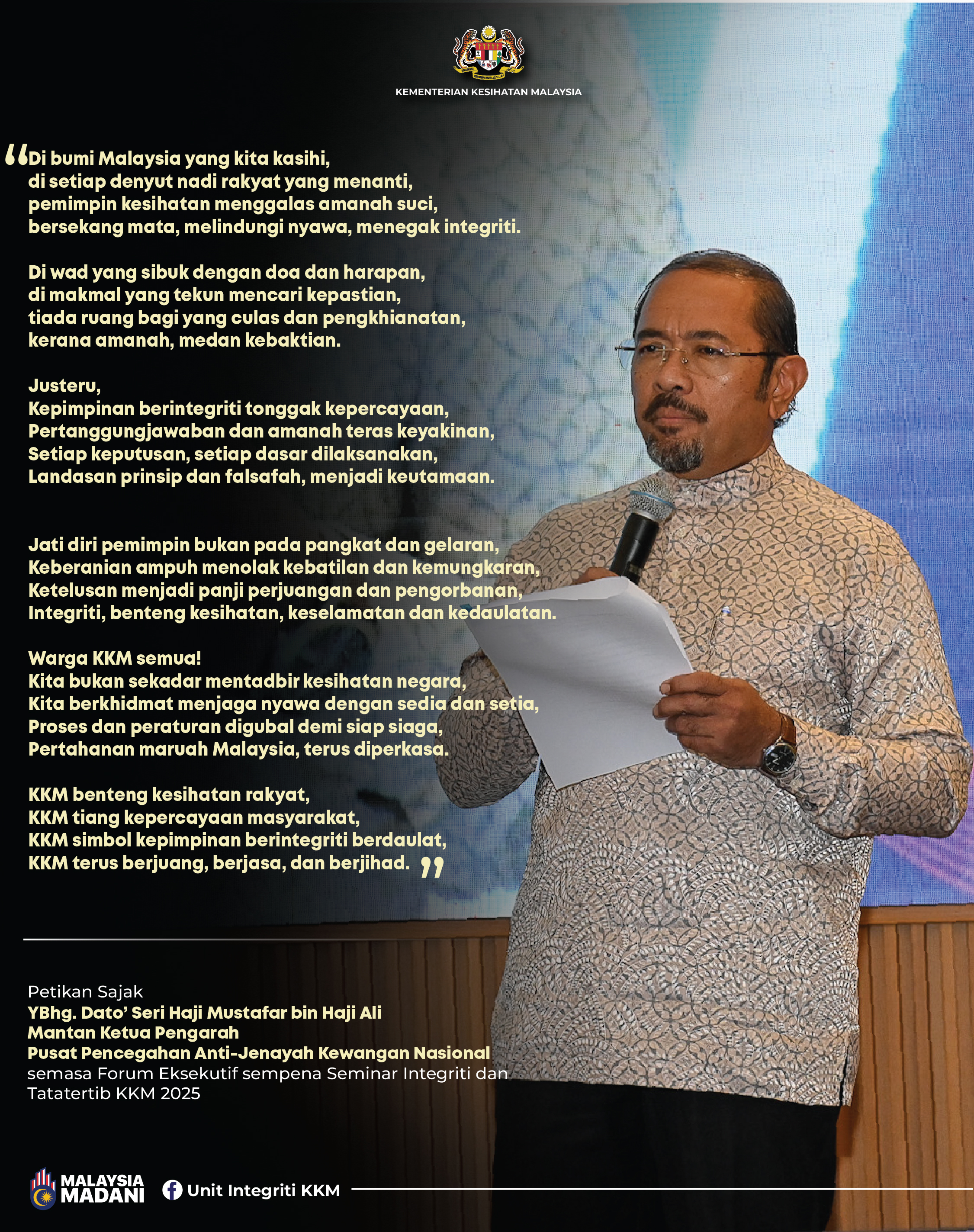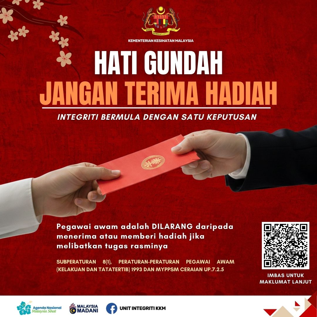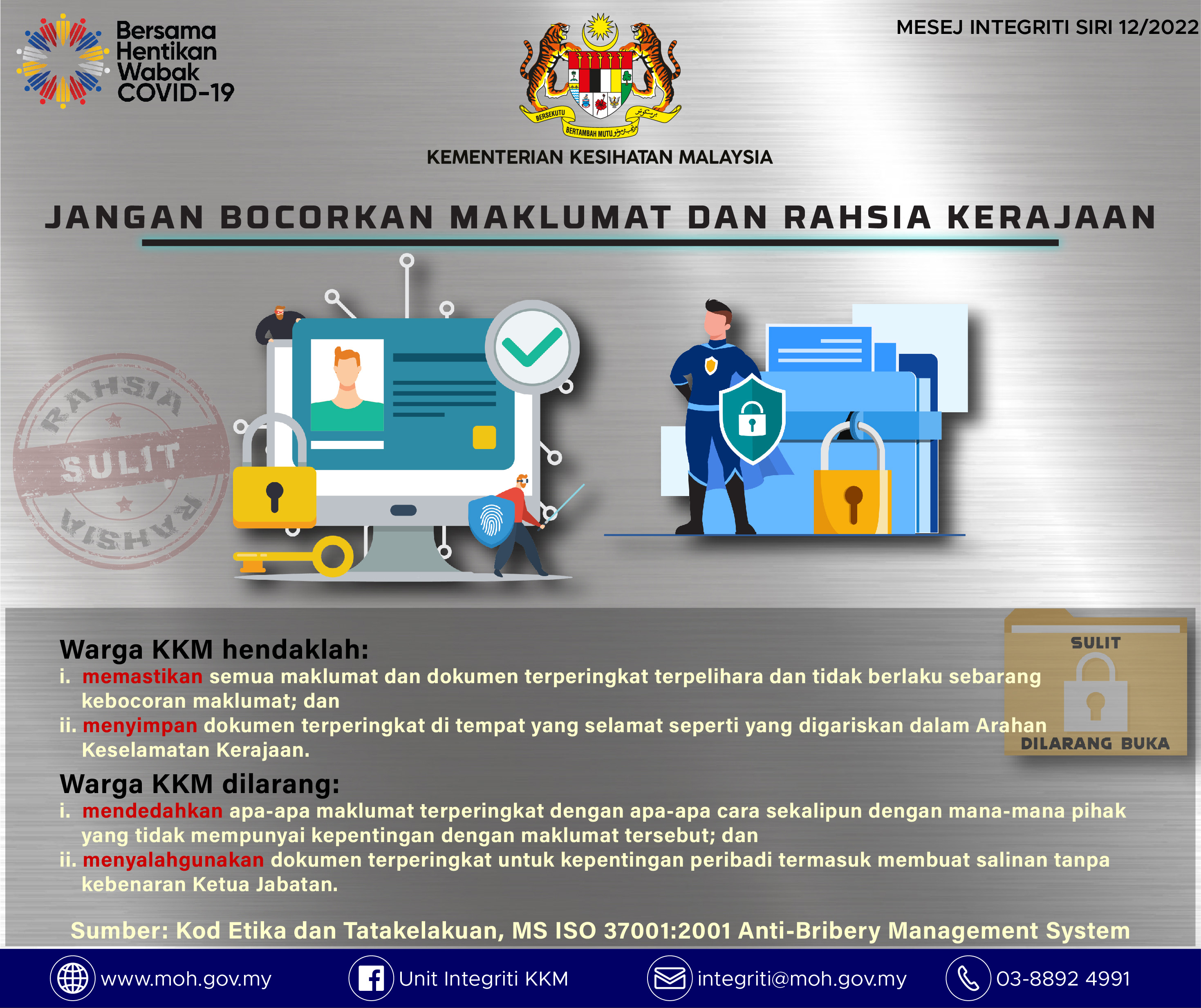 Sistem Pengurusan AntiRasuah atau Anti-Bribery Management System (ABMS) telah mula dilaksanakan di Kementerian Kesihatan Malaysia sejak tahun 2019 bagi mencapai matlamat “Toleransi Sifar Terhadap Rasuah” serta bagi membudayakan nilai-nilai integriti yang tinggi di kalangan warga kerja KKM. Berdasarkan pematuhan terhadap piawaian standard MS ISO 37001:2016 ABMS yang terkini, pensijilan MS ISO 37001:2016 ABMS Kementerian telah disambung bagi tempoh 15 Jun 2025 hingga 25 Jun 2028 dengan empat (4) skop yang berikut: